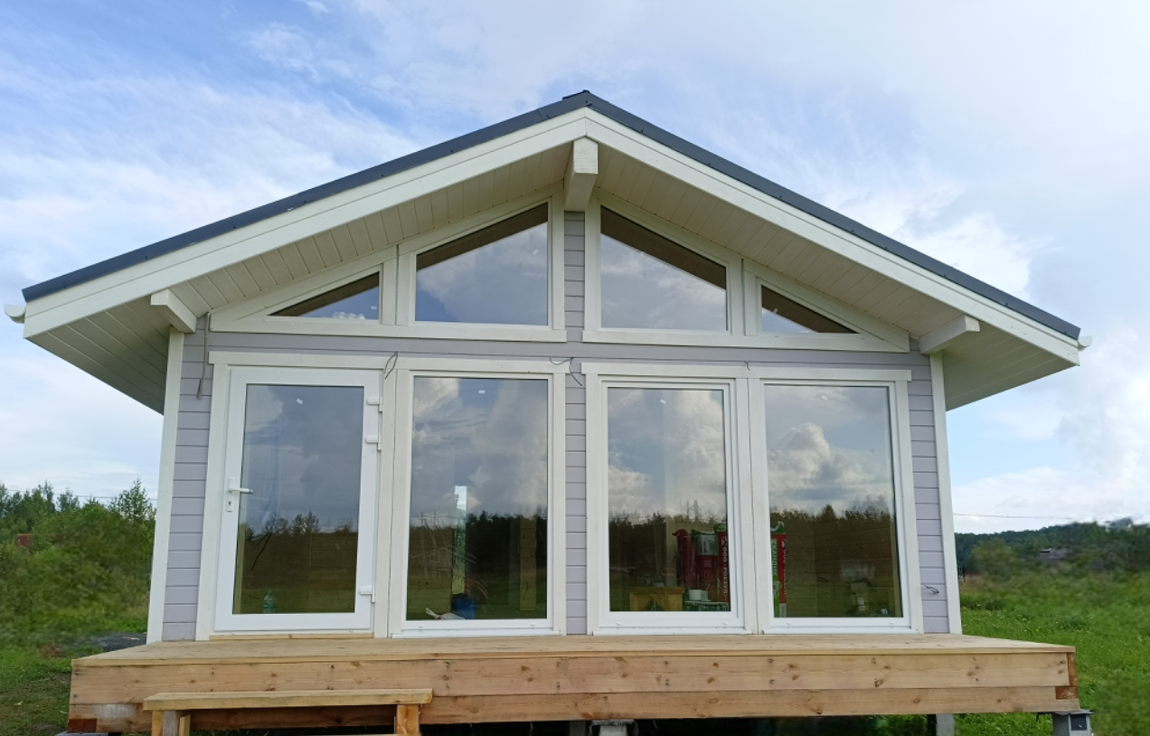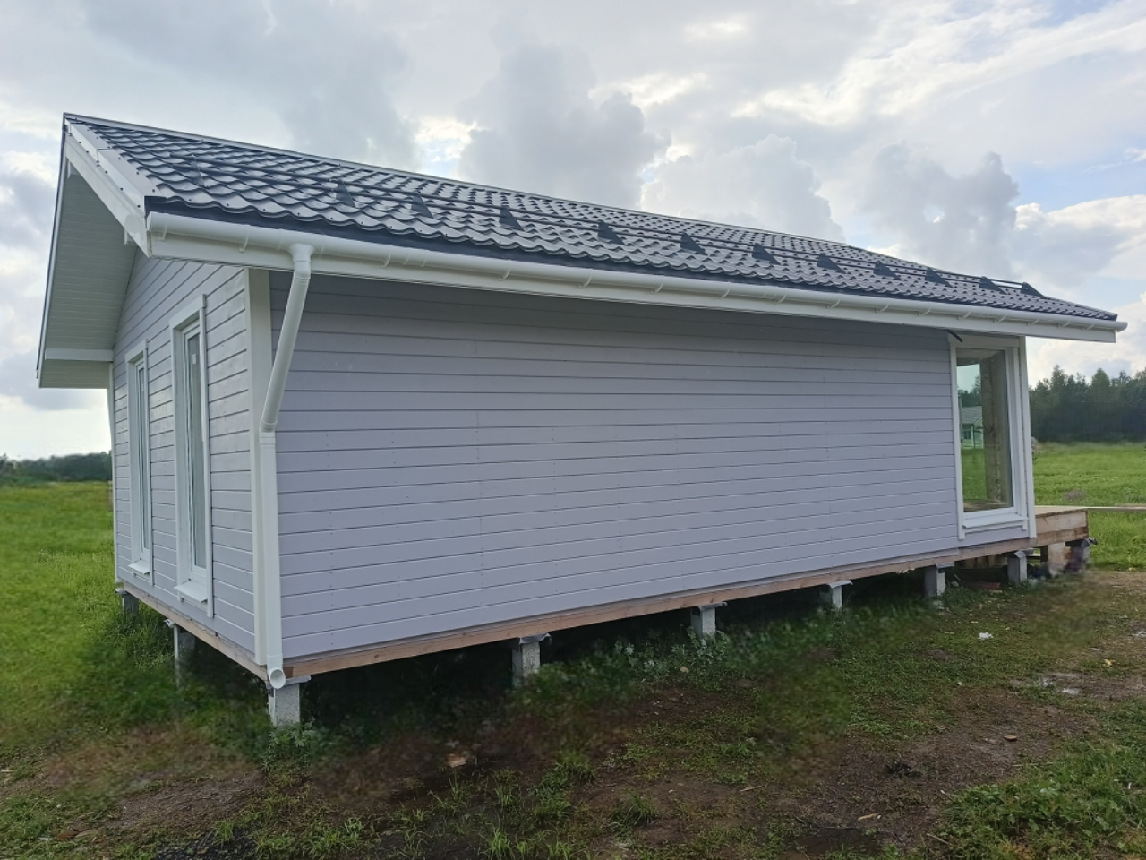 Дом в стиле Фахверк общей площадью 60 м2. Фундамент предоставлен заказчиком. Утепление произведено базальтовым плитным утеплителем 200 мм пол и кровля, 150 мм наружные стены. Отделка - имитация бруса. Выполнена разводка инженерных сетей по дому.